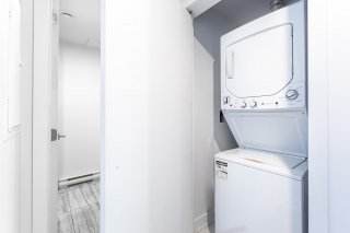 Inclus : Réfrigérateur, cuisinière, micro-ondes, lave-vaisselle, laveuse, sécheuse et un casier de rangement.