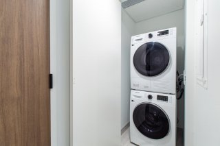 Inclus : Réfrigérateur, plaque de cuisson, four avec micro-ondes intégré, lave-vaisselle, lave-linge, rideaux et sèche-linge, casier