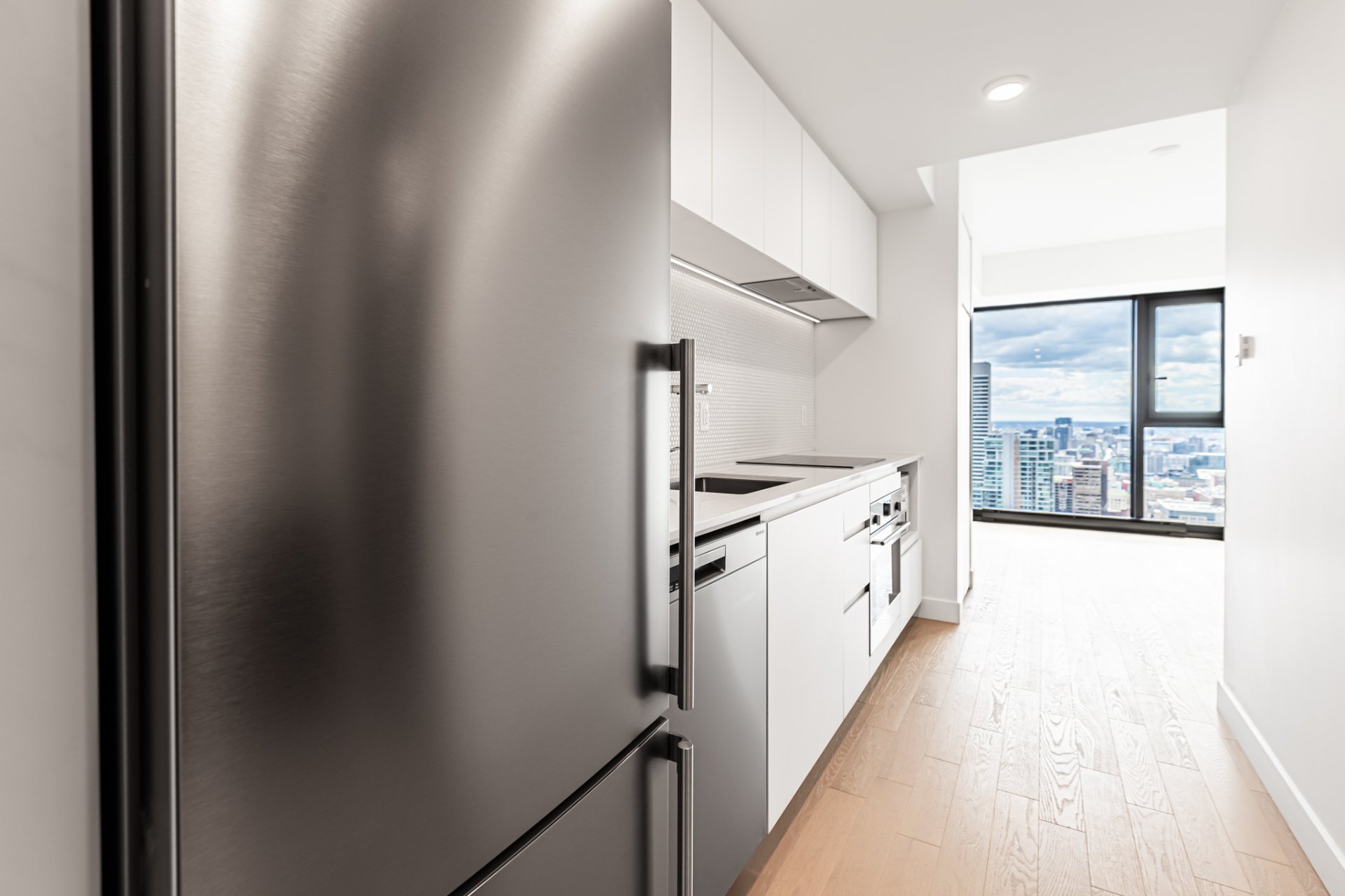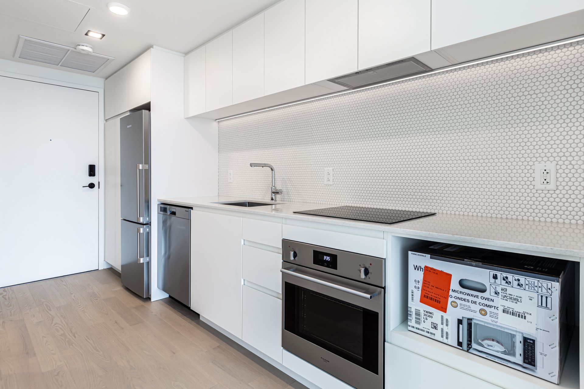 Inclus : Réfrigérateur, cuisinière, lave-vaisselle, micro-ondes, hotte de cuisine, laveuse, sécheuse, couvre-fenêtres, 1 espace de rangement